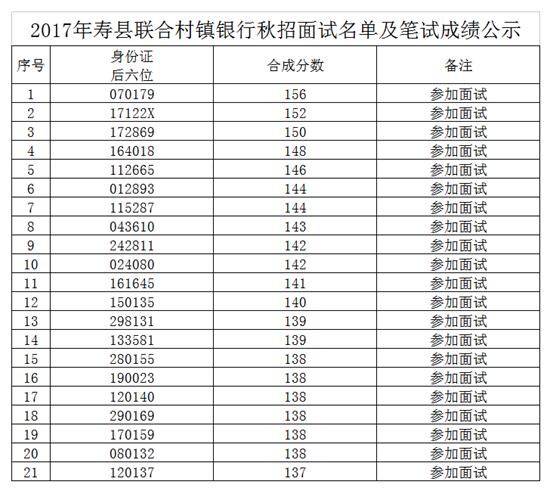 附件:2017年寿县联合村镇银行秋招面试名单及笔试成绩公示